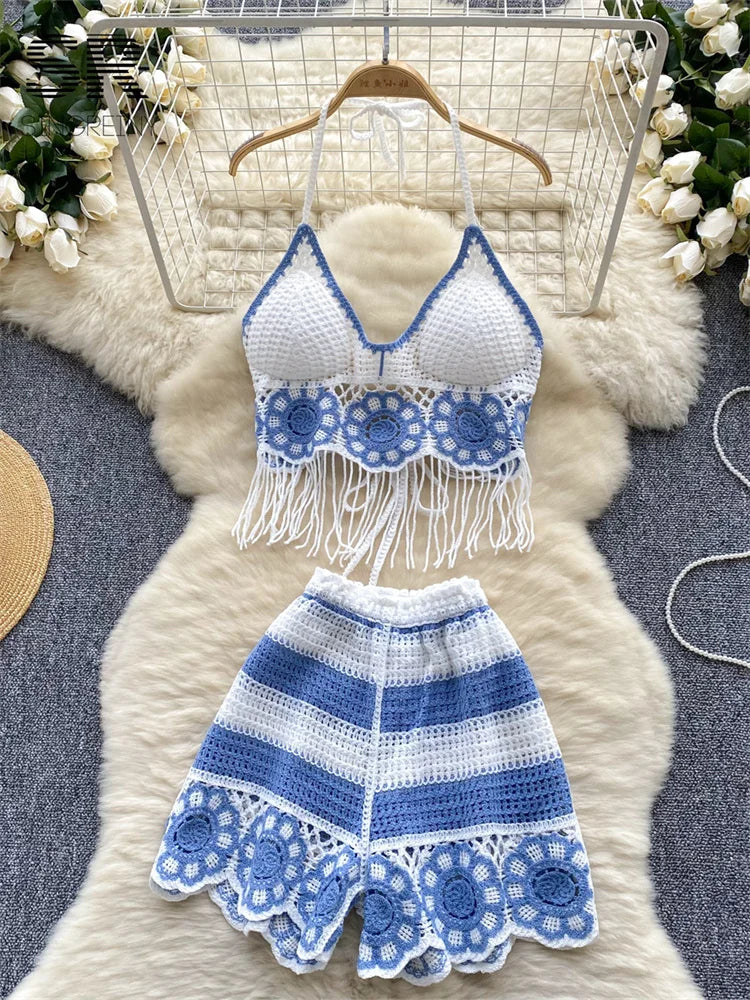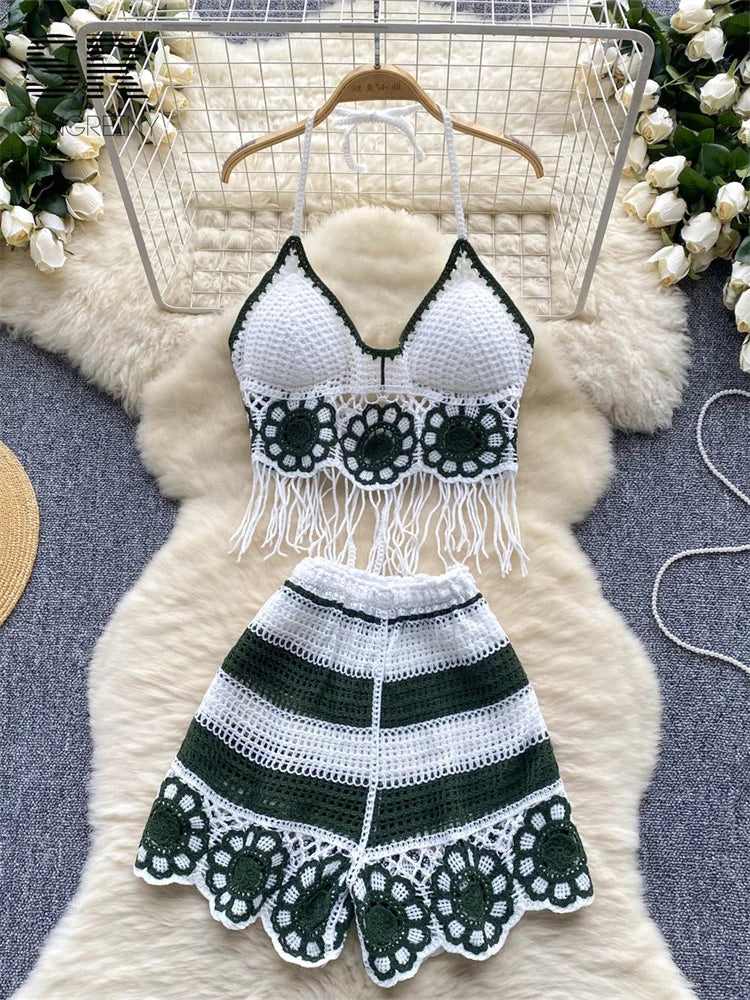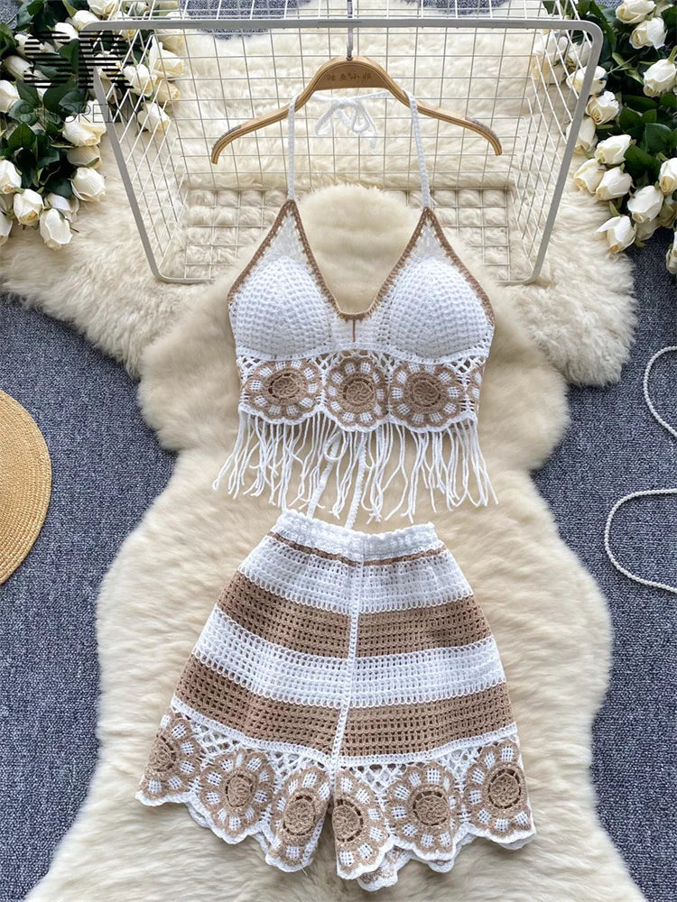 Descubre la perfecta combinación de estilo y comodidad con nuestro conjunto bohemio de dos piezas. Este elegante set incluye un sujetador con cuello halter decorado con borlas y shorts de pierna ancha con cintura elástica, ideal para vacaciones, días de playa o cualquier ocasión especial donde quieras lucir radiante.