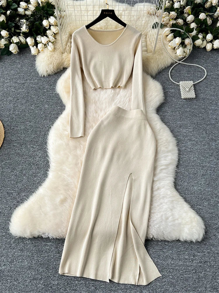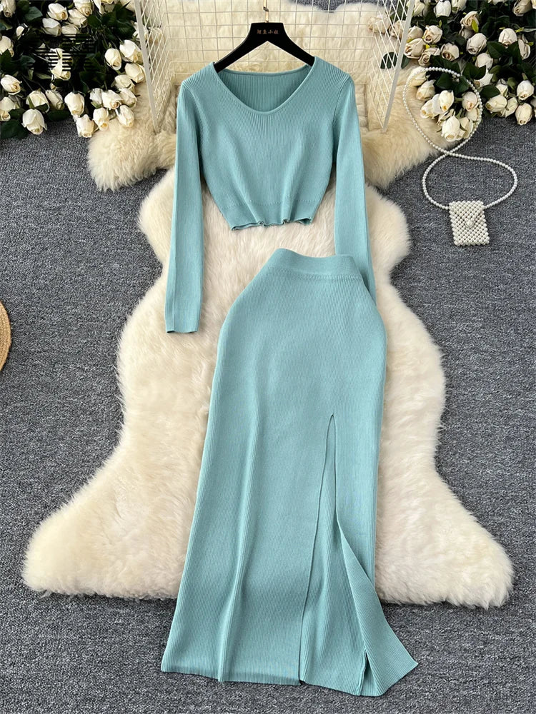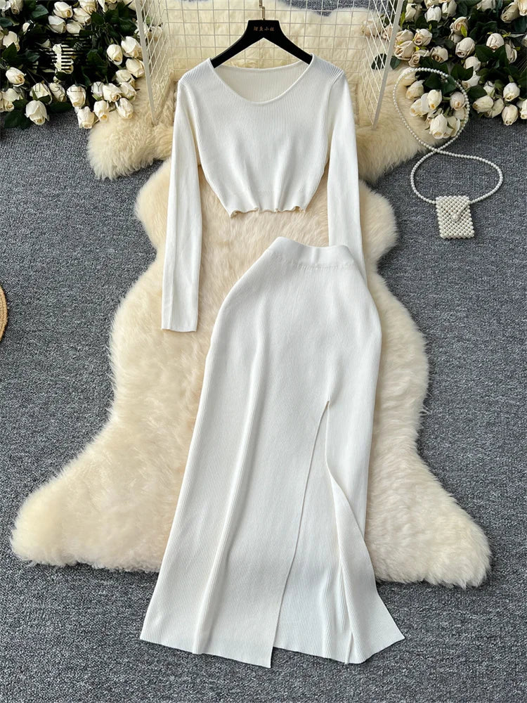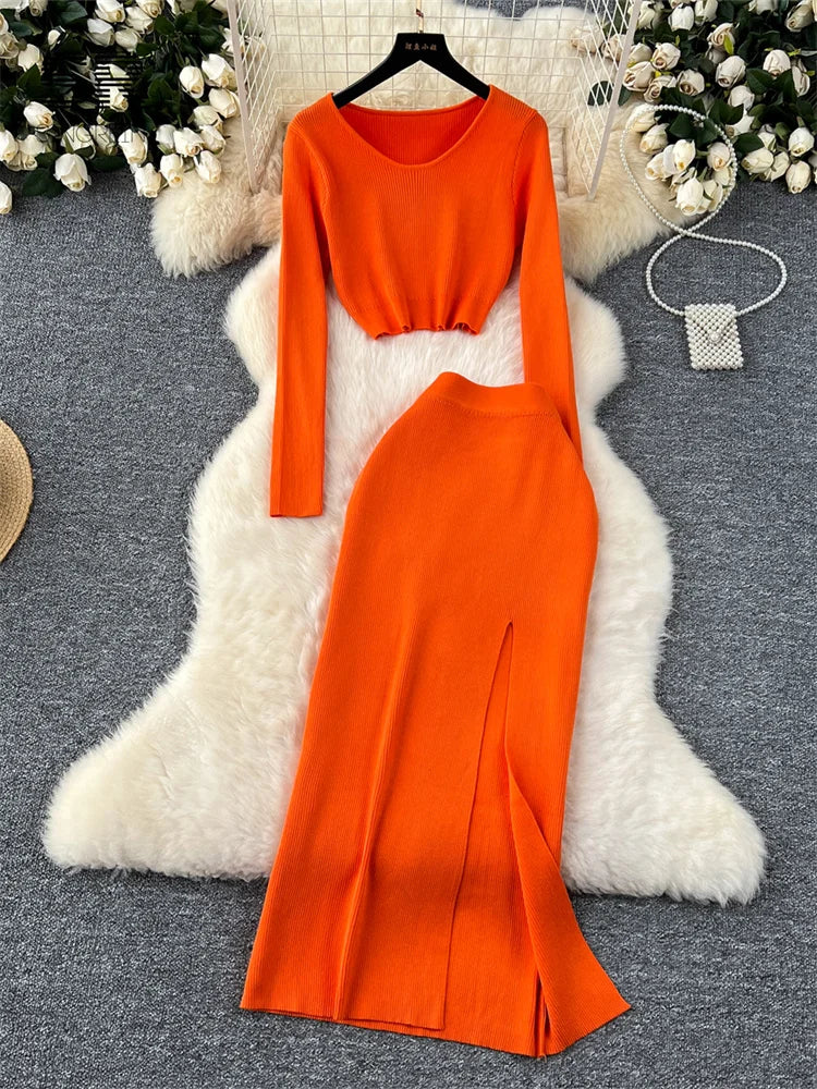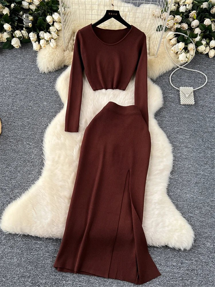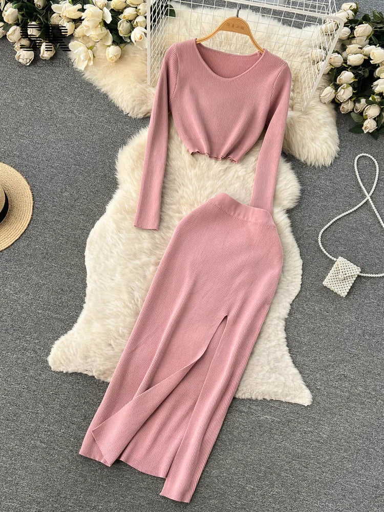 Discover the perfect combination of Korean style and modern elegance with this sophisticated fitted knit set for women. This elegant outfit includes a cropped sweater top and a fitted long skirt with side slit, creating a feminine and stylized silhouette perfect for Fall 2024.
