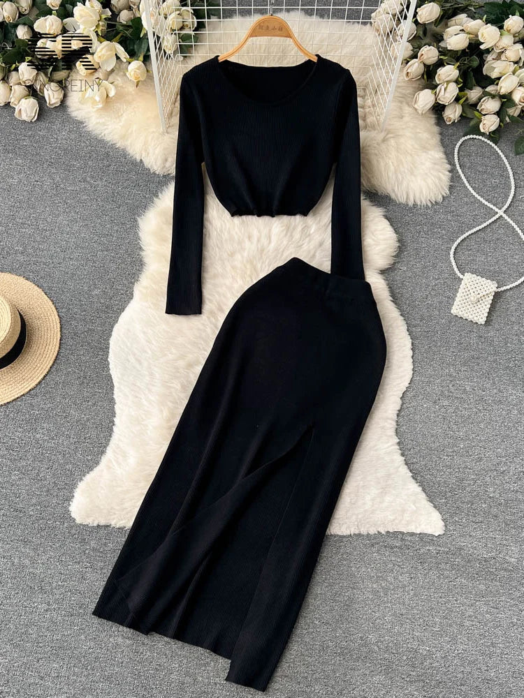 Descubre la perfecta combinación de estilo coreano y elegancia moderna con este sofisticado conjunto de punto ajustado para mujer. Este elegante set incluye un top corto de suéter y una falda larga ajustada con abertura lateral, creando una silueta femenina y estilizada perfecta para el otoño 2024.