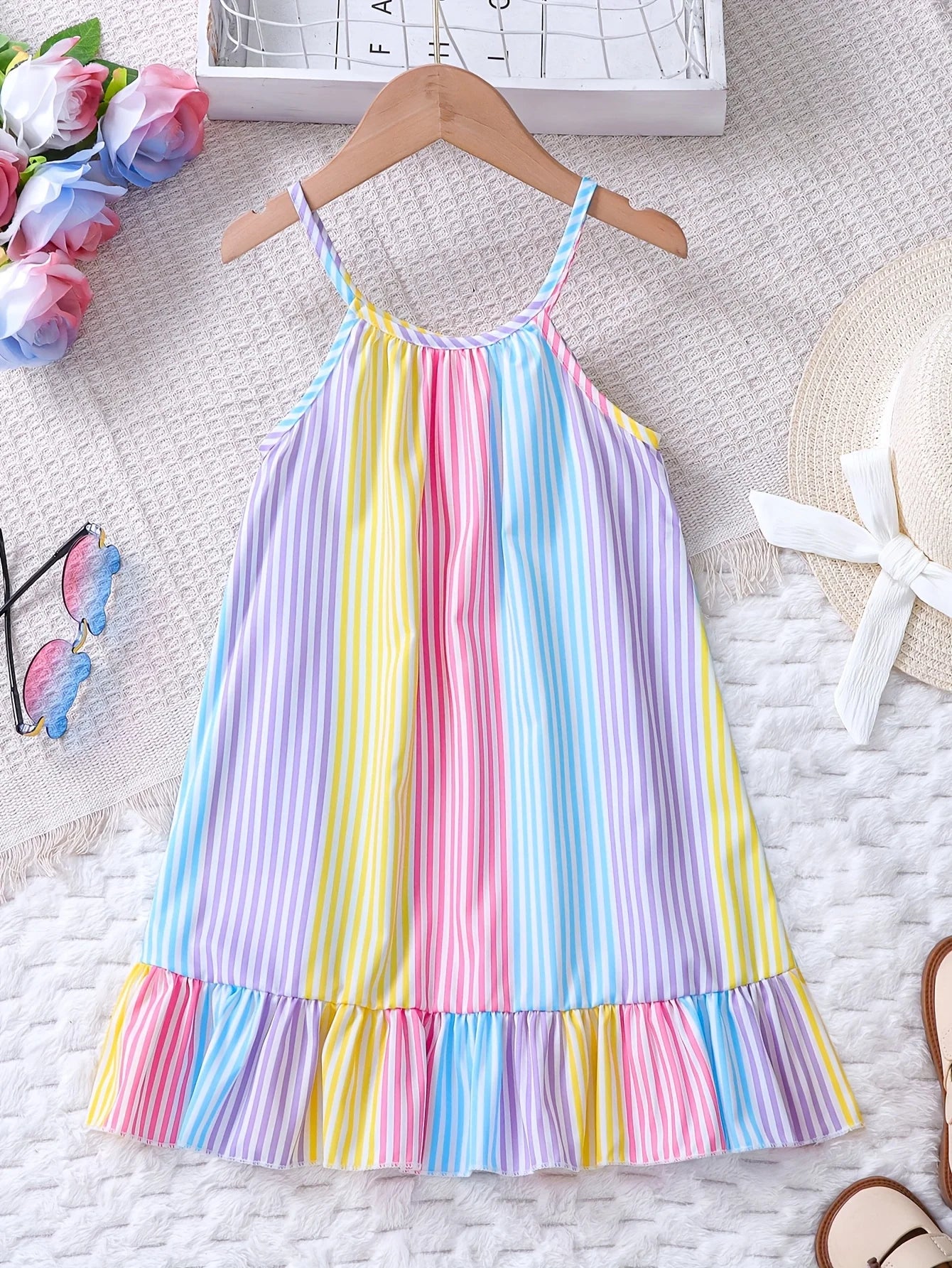 Vestido de Verano con Rayas Coloridas y Volantes para Niña Hermoso vestido con tirantes y dobladillo con volantes, perfecto para...
